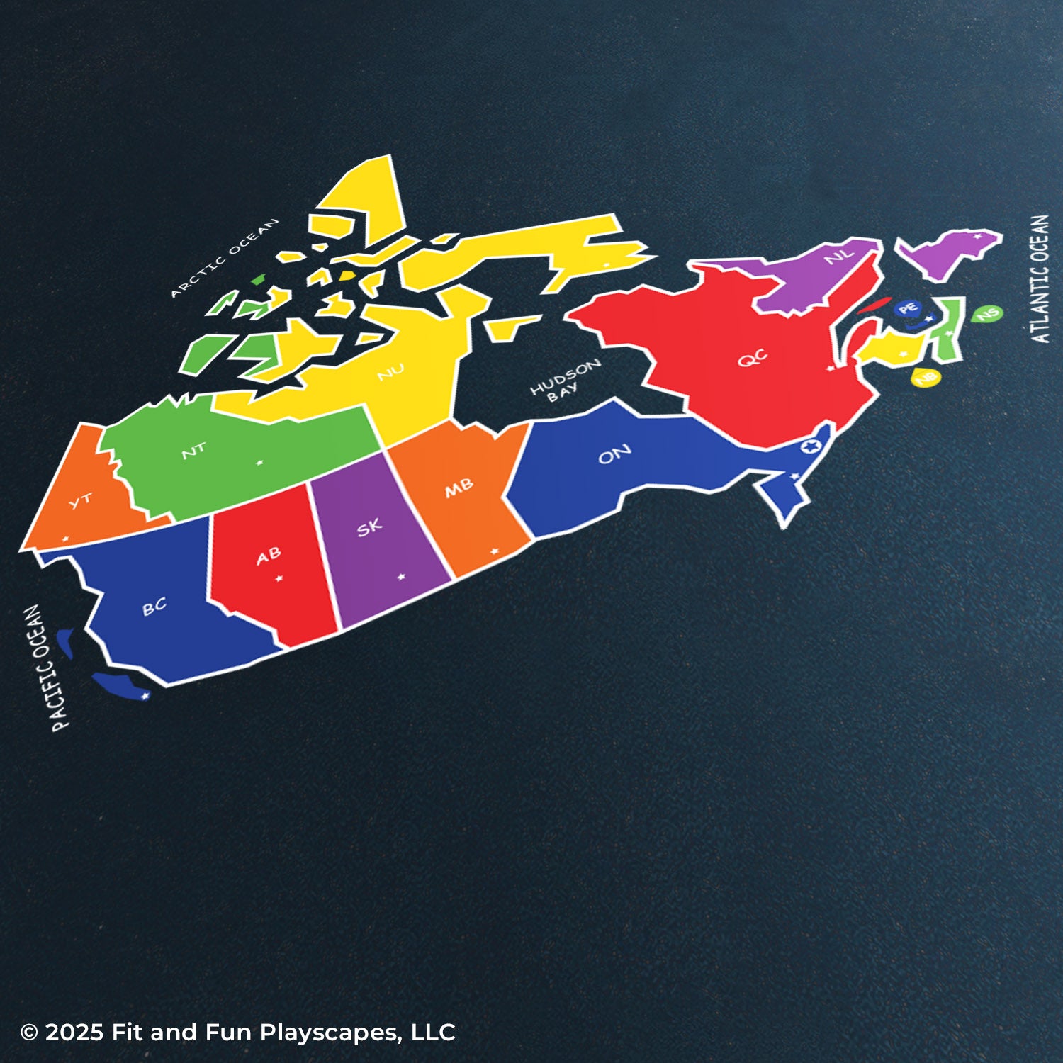 Endless educational possibilities with this large, engaging map of Canada. This large Canadian map playground stencil is a great, colorful addition to playgrounds and parks. It is the only map that identifies the capital of each territory with a star.