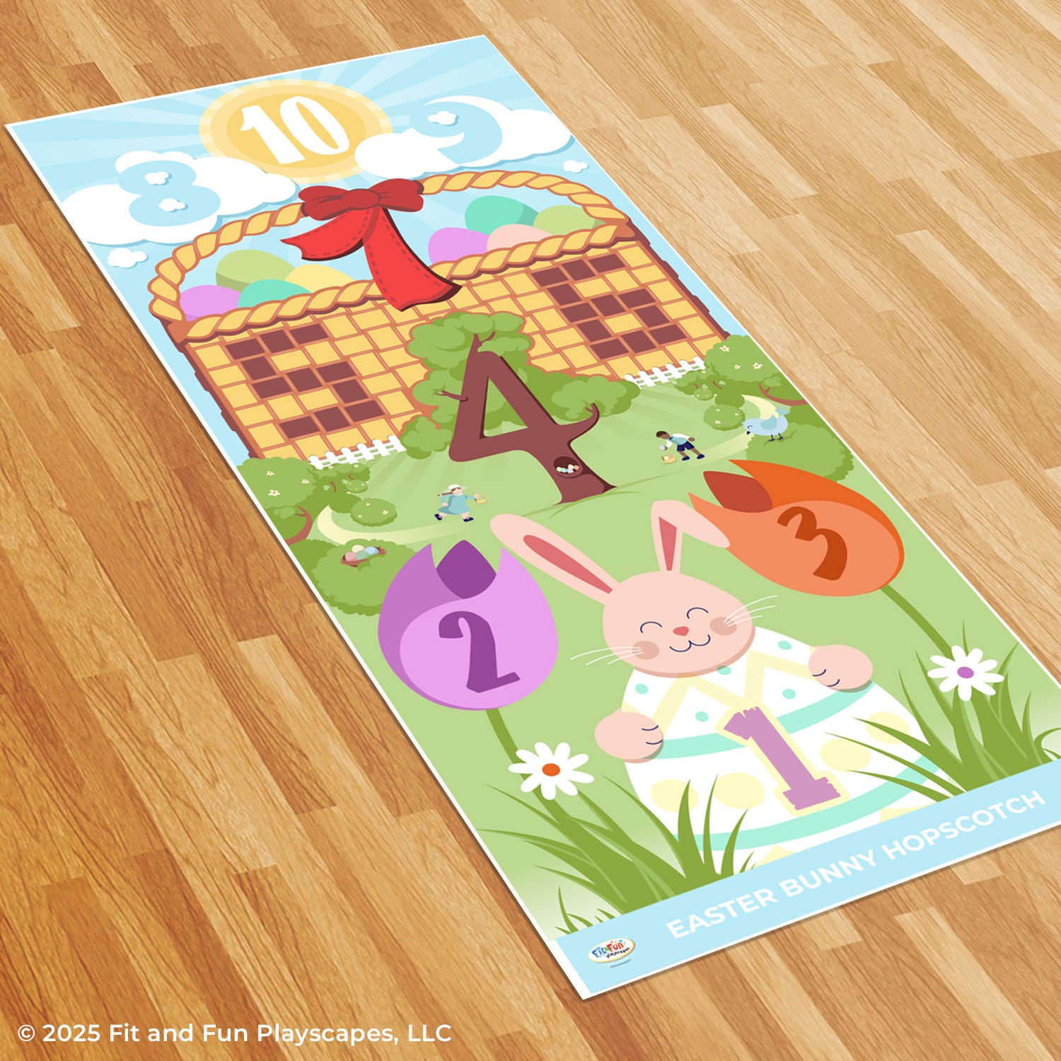 Hop and jump along with the Easter Bunny with this Easter-themed hopscotch. A limited edition, original design only available at Fit and Fun Playscapes, this hopscotch is the only one of it's kind with many references to Easter iconography. Kids can learn how to play hopscotch, a timeless game that the whole family can enjoy! Great for kids 5-8 years old.