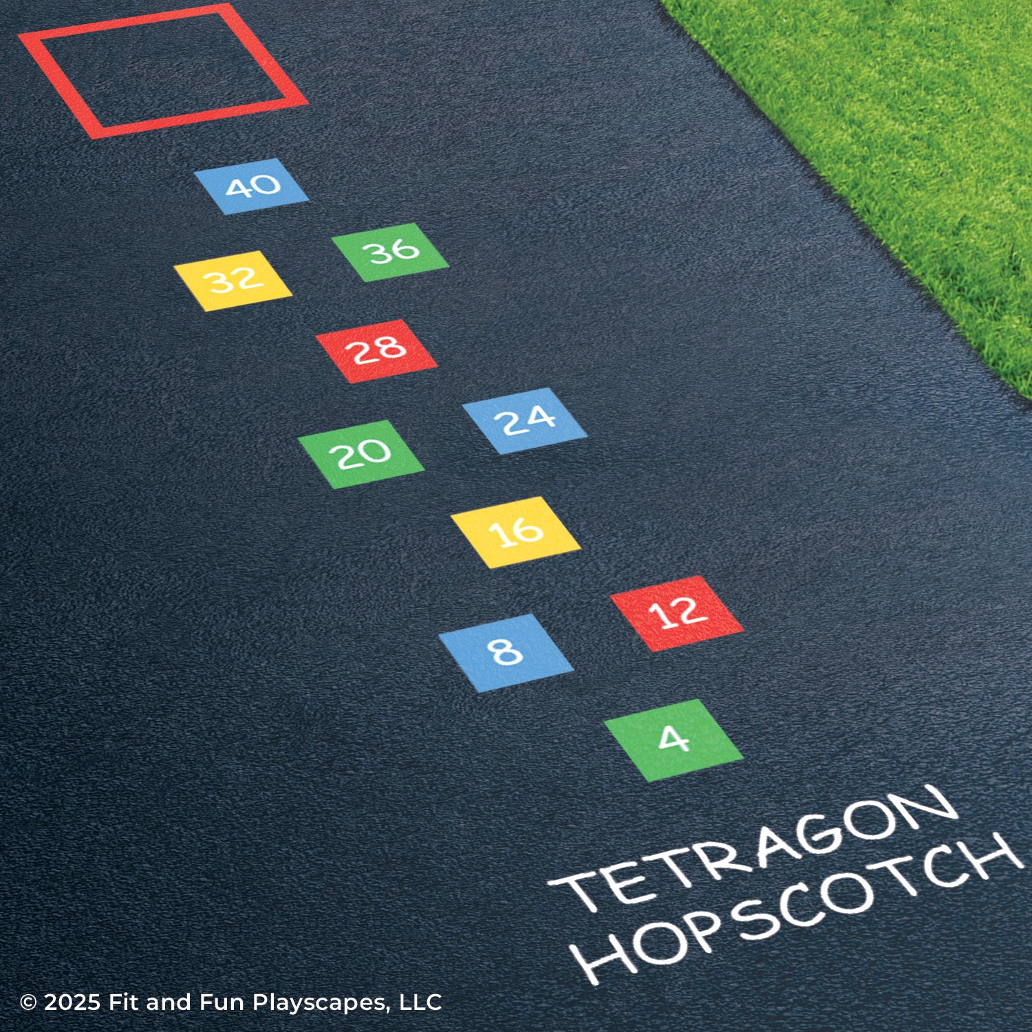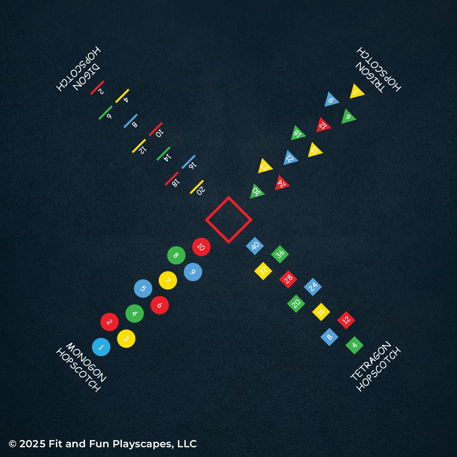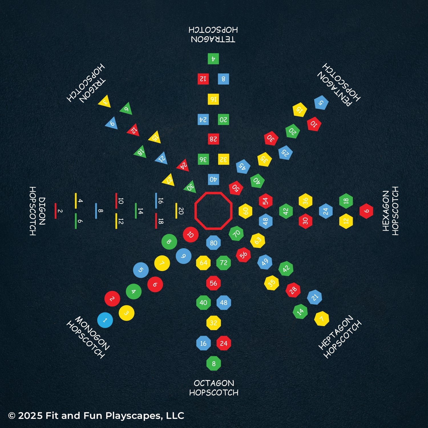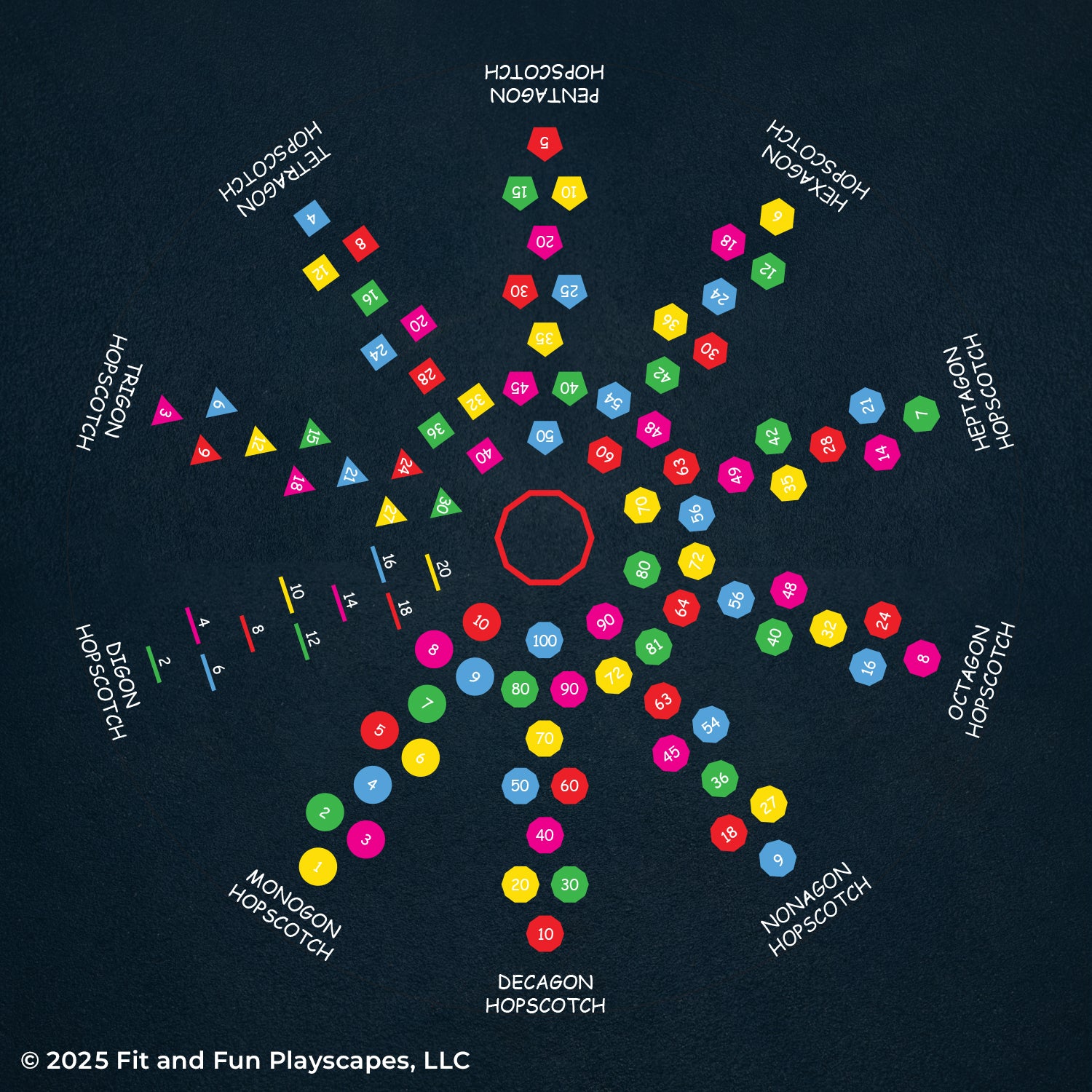 When multiple Skip Count Geometry Hopscotch stencils are combined, the shape with the most facets is used as the 'hub.' For example, the center landing 'hub' in the Tetragon Layout is a square, while the center landing 'hub' in the Decagon Layout is a decagon.
