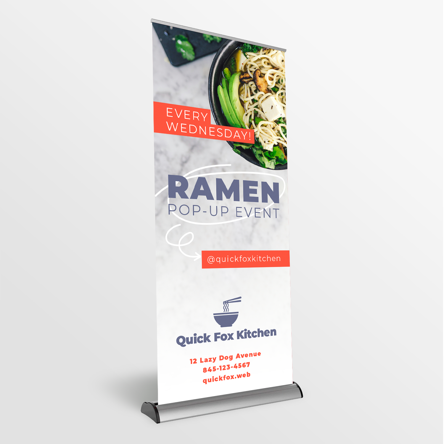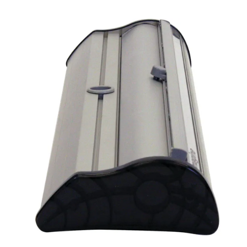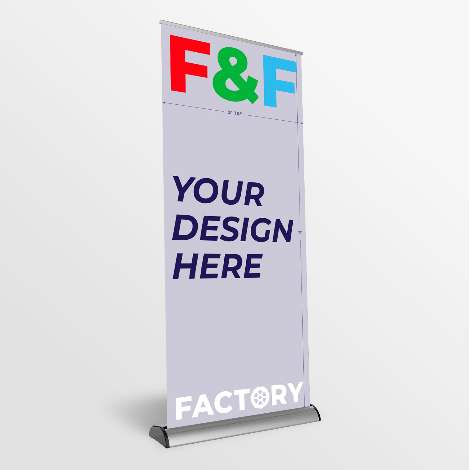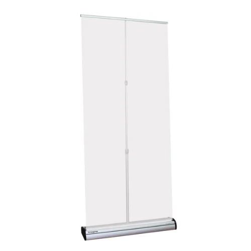 - Add your own branding using the slide in graphic channel along the banner stand base