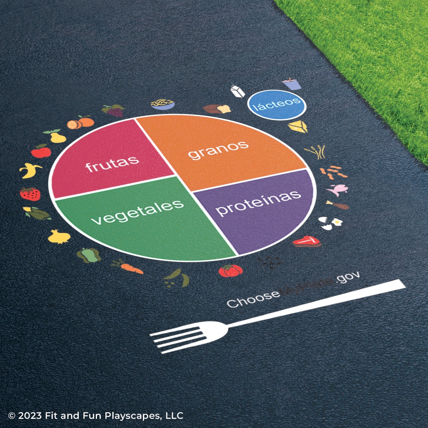 Bring nutritional information and support healthy eating habits with this large, playground stencil, now in Spanish! You can lay out the food stencils as shown or sprinkle them throughout the playground area and create unique, engaging games.